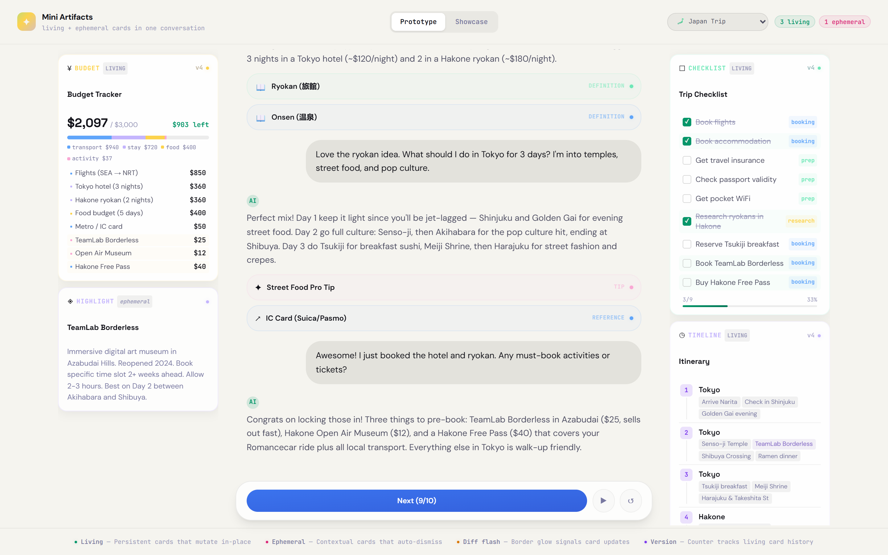 An experiment in giving AI a spatial layer — conversation-aware cards that spawn, evolve, and dissolve to reduce cognitive load in planning tasks.