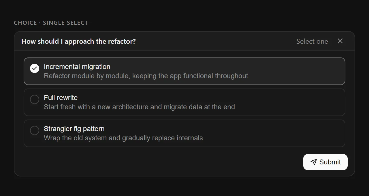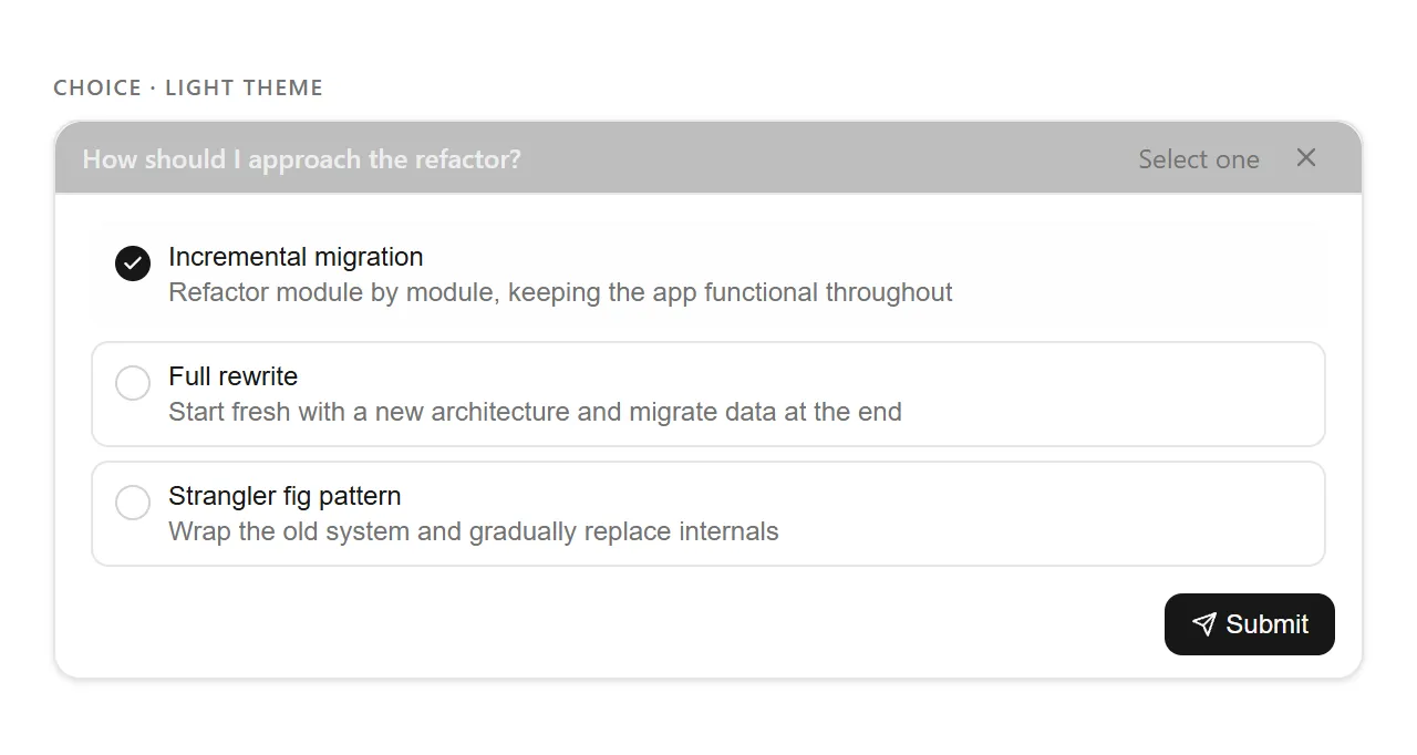 For decisions with discrete options. Supports single-select (radio behavior) and multi-select (checkbox behavior). Each option includes a label and optional description, with clear visual feedback on selection state.