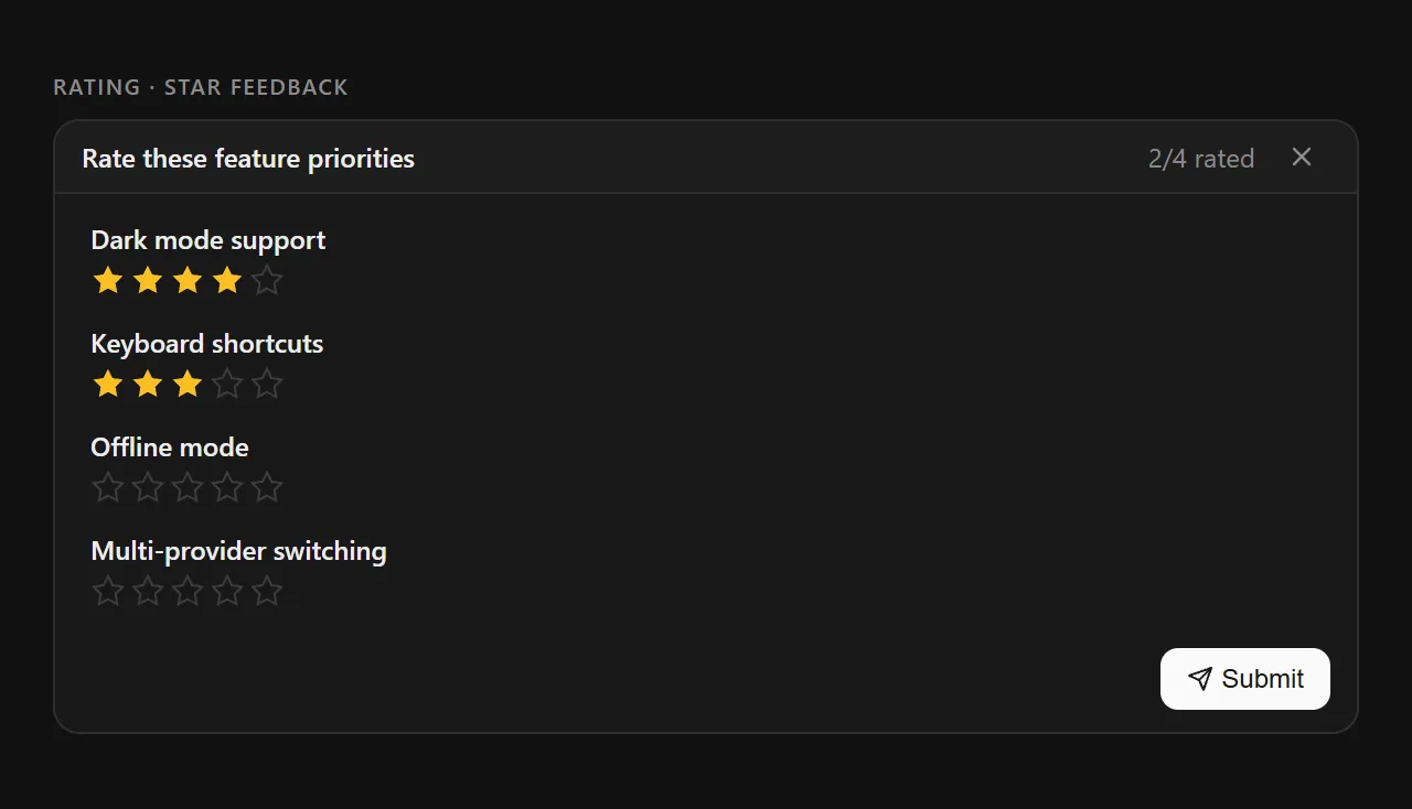 For priority ranking, satisfaction scoring, or weighted input. Multiple items can be rated in a single card with configurable scales. The header shows progress (“2/4 rated”) mirroring the checklist pattern.
