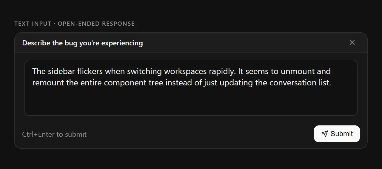 For free-form answers that don't fit structured options. Supports single-line and multi-line modes with appropriate keyboard shortcuts (“Enter” vs “Ctrl+Enter to submit”). Used when the AI needs narrative detail.