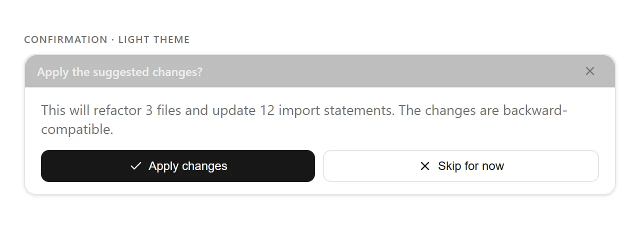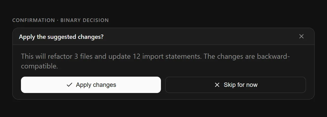 For yes/no gates: “Apply the suggested changes?”, “Proceed with deletion?”, “Use the default config?”. Custom labels, keyboard shortcuts (Enter = confirm, Escape = cancel), and an optional description for context.