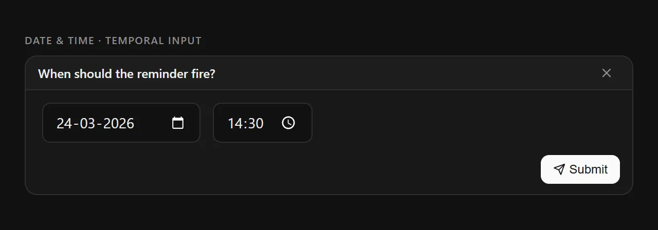 For scheduling, deadlines, or time-bounded context. Supports date-only, time-only, or combined datetime modes with native platform pickers. Optional min/max constraints prevent invalid selections.