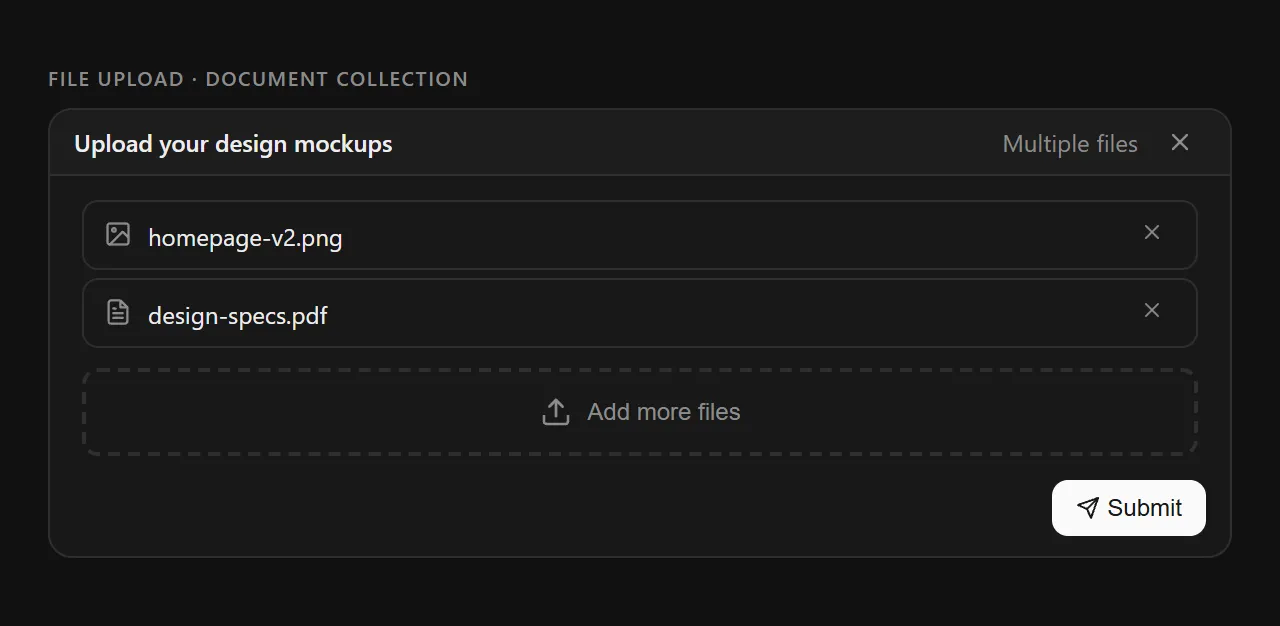 For when the AI needs documents, images, or data files. Supports single and multi-file modes. Shows file type icons (image vs. document), allows removal of individual files, and uses a dashed-border upload zone as an affordance.