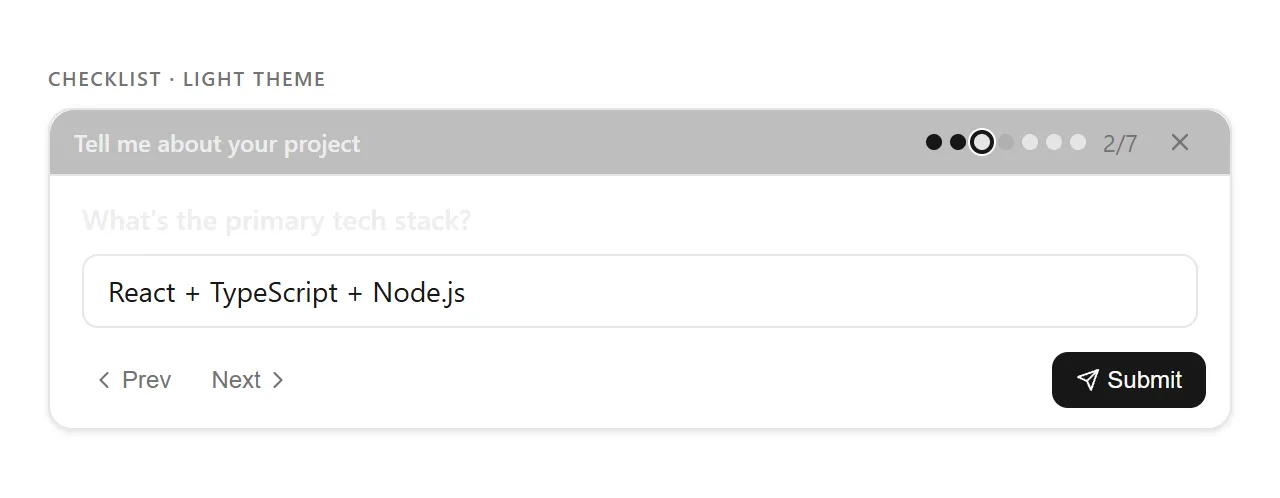 The workhorse card. Presents a series of questions one at a time with progress dots showing answered (filled), current (ring), skipped (dim), and pending (empty) states. Users navigate freely with Prev/Next and can skip any question. A counter (“2/7”) provides explicit progress.
